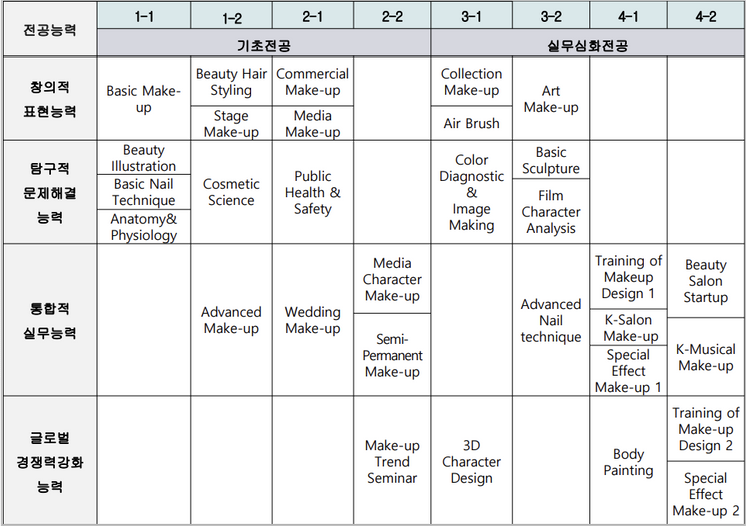 グローバルメイクアップデザイン学科は、次のような基準に従って教科目を履修し、卒業要件を満たさなければなりません。